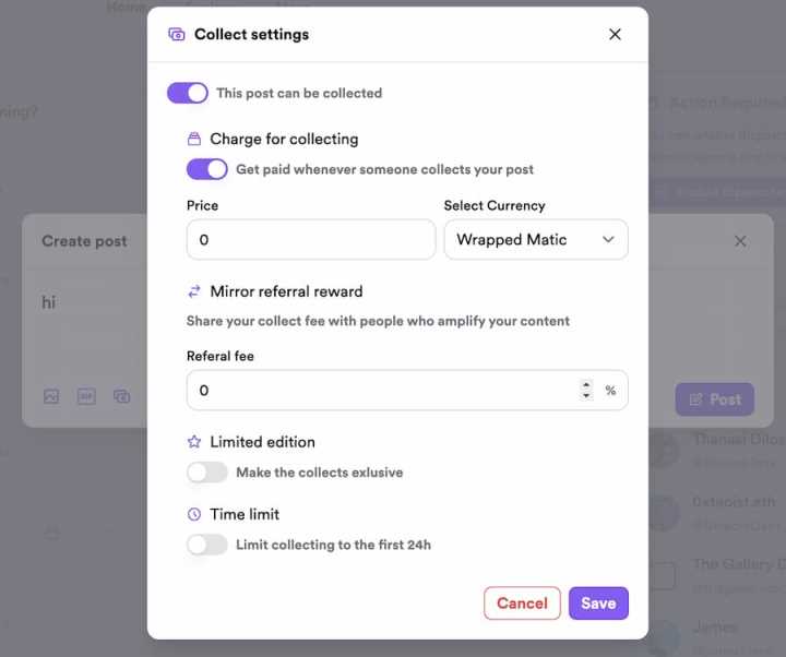 此外,在 Lenster 上发布帖子既可以选择可访问对象,如关注的人、被关注的人、朋友的朋友以及所有人,也可以根据需求开放是否可供其他人收藏的选项,还可以对帖子收藏者设置收藏费用,以及与帖子推荐人分享费用。Lenster 也是黑客松 LFGrow 的 12 个获胜方之一。