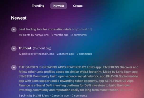 Refract 自称是一个建立在 Lens 上的链接趋势排行榜 Link Board,在 Refract 上可以分享链接,发现新项目、热门文章和最新趋势。不过,当前 Refract 上在发布链接时一直报错,目前趋势页面没有内容,时间线一栏中最新一条链接为两个月之前发布的内容。