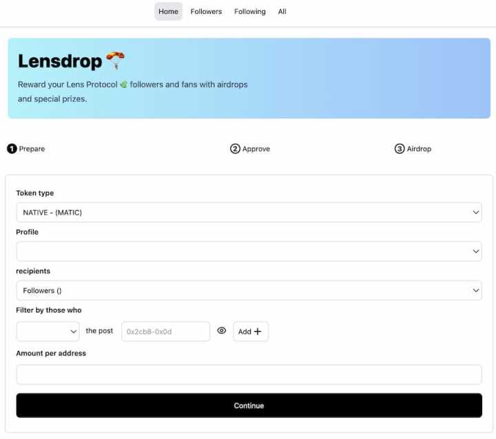 Lensdrop 允许创作者用空投或者一些代币其在 Lens Protocol 上的粉丝。