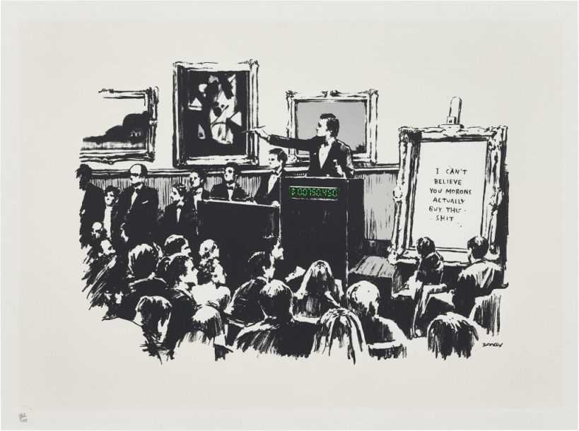 知名街头艺术家班克西的《傻子》,该作品创作于 2006 年,意在讽刺肤浅、过度膨胀的艺术市场。画作描绘了一个拥挤的拍卖大厅,拍卖师旁边是一件镶有华丽边框的作品,上面写着:「我不敢相信你们这些傻子真的买了这个。」