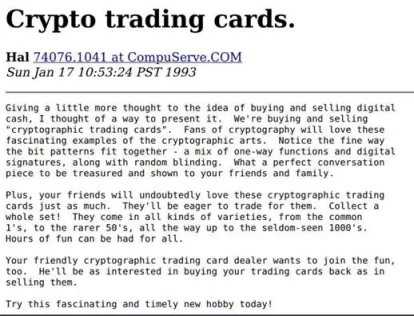 1993 年,一位名叫 Hal Finney 的密码学家在给密码朋克成员的一封电子邮件中,提到了加密货币交易卡的概念。
