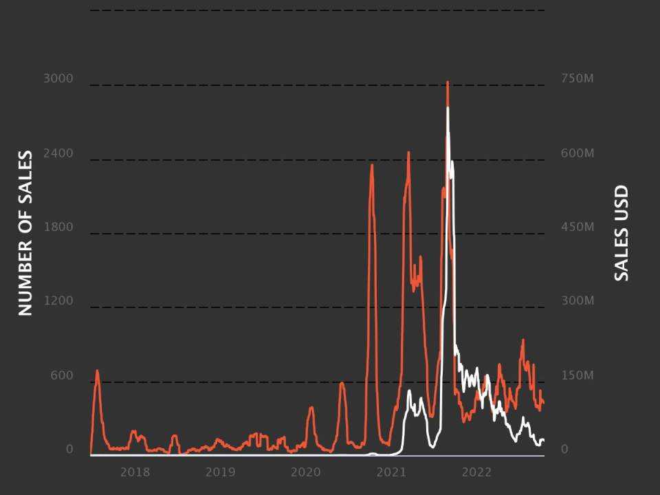 或许你难以理解,这些毫无作用甚至没有美感的图片为什么这么值钱?在近期加密寒潮的冲击下,曾经如日中天的 NFT 突然跌落神坛,日成交额从巅峰时期的 36 亿美元跌至近期的 2 亿美元。于是有人唏嘘:NFT 神话破灭了。