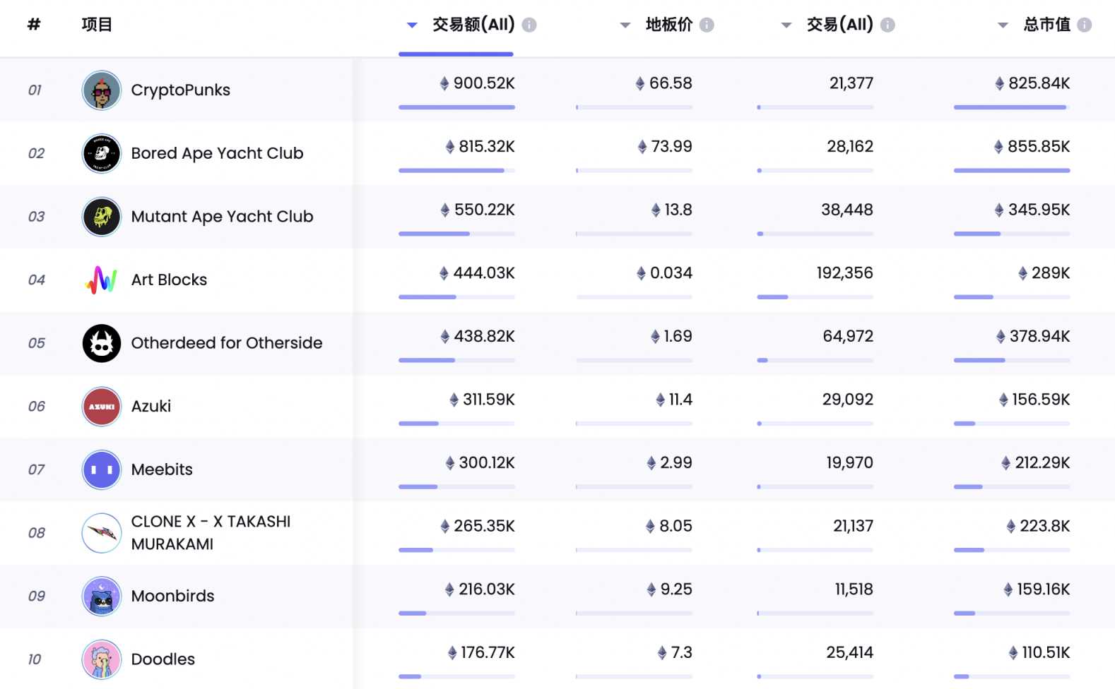 截至目前的 NFT 总交易额排名,前十名中 PFP 占据大部分席位,数据来源:NFTGo