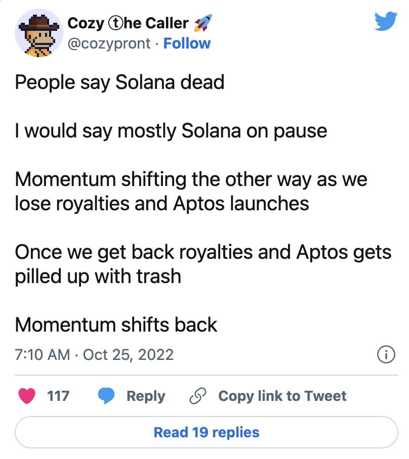 近期,因为销售市场回绝向创始人付款版税,紧紧围绕Solana NFT销售市场激情在Crypto Twitter上一直减少,成交量也在慢慢降低,这也许不仅主要是因为股市熊市的槽糕气氛,竞争对手区块链互联网Aptos好像也在盗取一些Solana NFT操盘手的专注力和资产。
