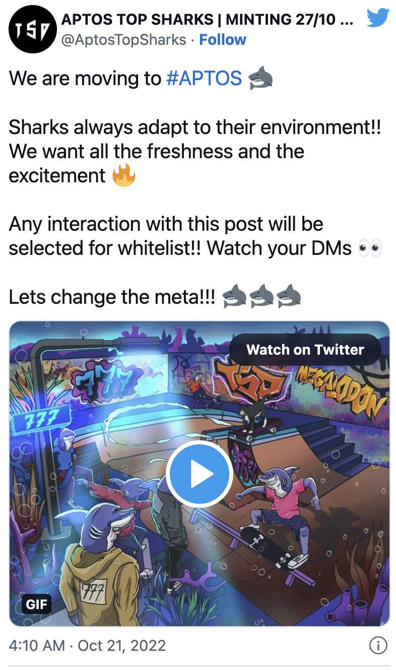 这类改变的趋势也驱使一些隐性的创作者离去Solana,NFT新项目——如Zodiac World、Mogu Dragonz和Aptos Top sharks运用那股风潮公布他们正在“转为 Aptos”。与此同时,目前新项目Okay Bulls也表示要转换到Aptos,让NFT持有人换为Aptos版本。