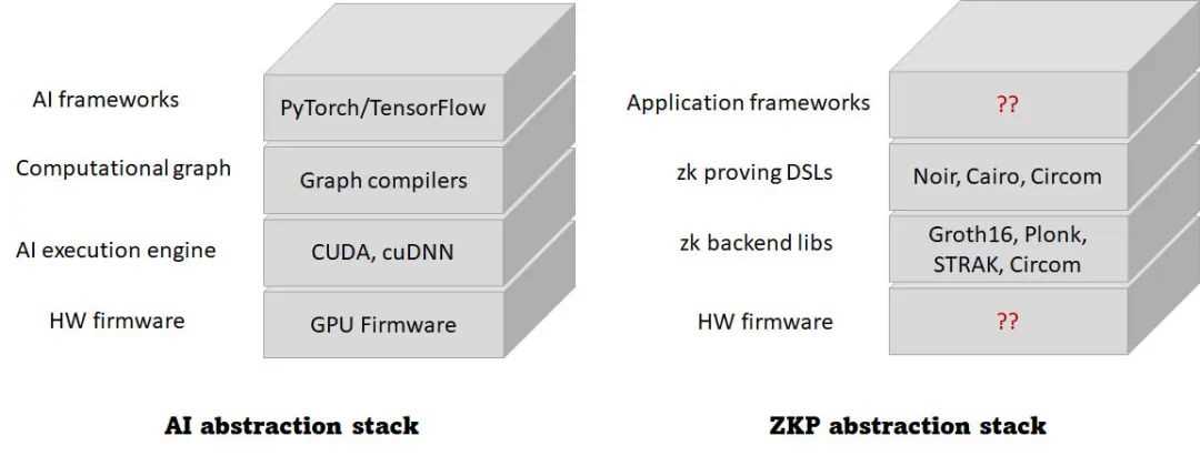 为了释放 ZKP 的潜力,需要构建几个抽象层和工具。这些抽象对于简化 ZKP 应用程序的开发过程是非常必要的,而且应该允许每一组开发人员专注于他们最擅长的工作。例如,应用程序开发人员不应该担心 ZK 电路的底层细节及其工作方式。再次使用 AI 的类比,通过创建多个抽象层,AI 可能取得巨大进步。使用这些抽象,AI 应用程序开发人员不需要担心硬件资源分配。TensorFlow 和 PyTorch 等框架抽象了所有这些底层细节。
