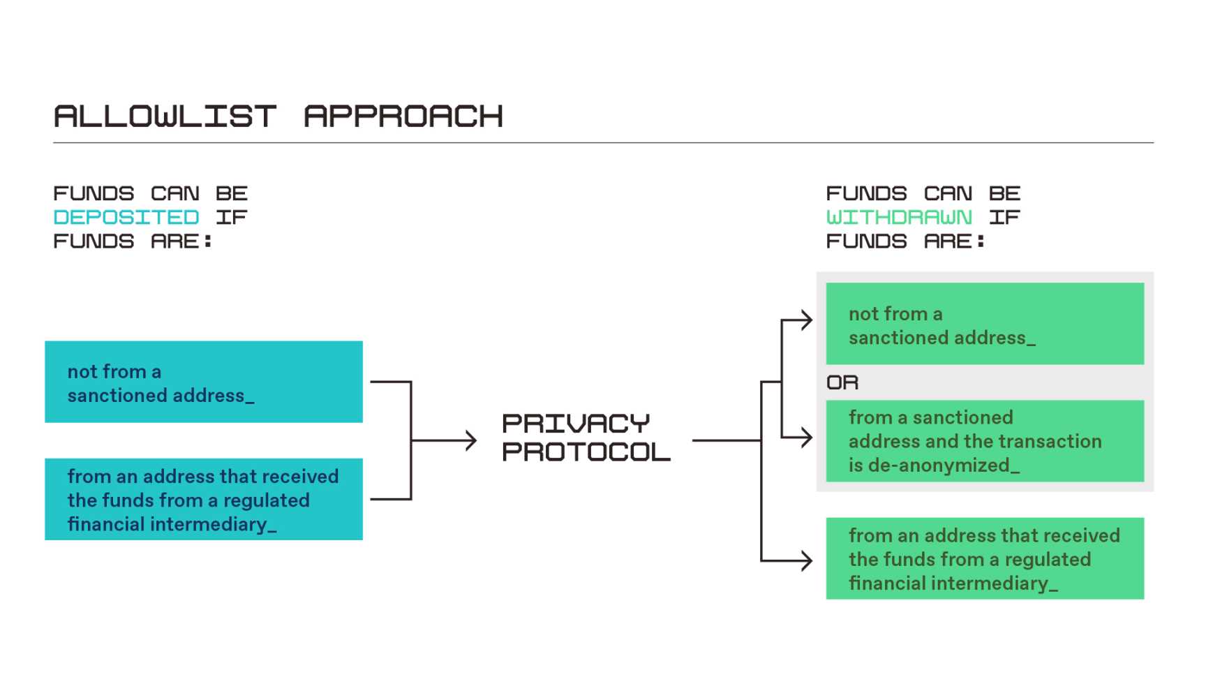 只有当存款地址(i)不在适用分析公司的 SDN 列表上(即,该地址不在屏蔽列表上)或(ii)从受监管的金融中介机构收到上述资金(即,该地址在许可列表上)时,该方法才允许用户在隐私保护协议中存入资金。该许可列表可以由控制协议的去中心化自治组织(DAO)随时间进行管理和更新,也可以来自与受监管的金融中介机构相关的链上地址预言机(类似于 Chainalysis 运营的黑名单预言机)。某些隐私保护技术可以将这一概念进一步推进,将其协议直接连接到受监管的金融中介机构,允许用户直接从这些中介机构将资金存入协议,而不需要先将资金转移到单独的钱包地址。