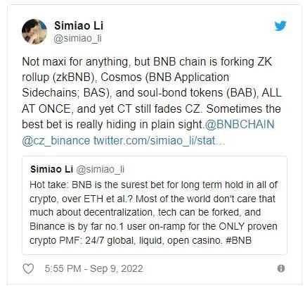 总的来说,我们一直认为 BNB 生态系统被加密原生投资者低估了。它是东方的以太坊,背靠着仁慈的独裁者,具有强大的执行力和草根加密玩家的支持。我们一直是 BNB 的长期看涨者,这件事只是朝这个方向发展的催化剂。