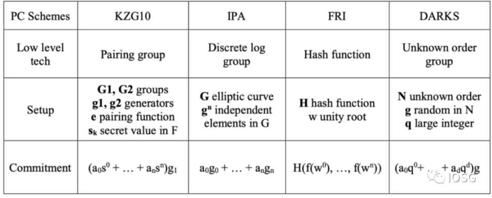 当一个待证明事物经过电路(如 R1CS/QAP)处理之后,会得到一组标量和向量,之后被用来产生多项式或者其他形式的代数形式如 inner product argument (groth16)。这个多项式依然很冗长,如果直接生成证明那么无论是证明大小或是验证时常都很大。所以我们需要将这个多项式进一步简化。这里的优化方式叫做多项式承诺,可以理解为多项式的一种特殊的哈希值。以代数为基础的多项式承诺有 KZG, IPA,DARK,这些都是利用椭圆曲线产生承诺。