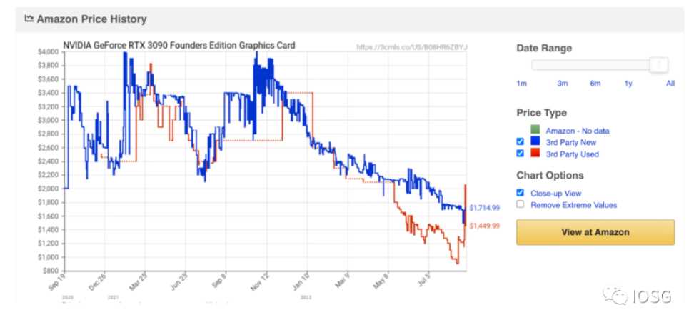 在以太坊 The Merge 发生之后,不可避免将会有大量的 GPU 算力冗余(部分受到以太坊共识改变的影响,GPU 巨头英伟达股价距年初已经跌去 50%,同时库存冗余也在不断增加),下图是英伟达 GPU 旗舰产品 RTX 3090 的成交价格,也显示买方势力较为薄弱。