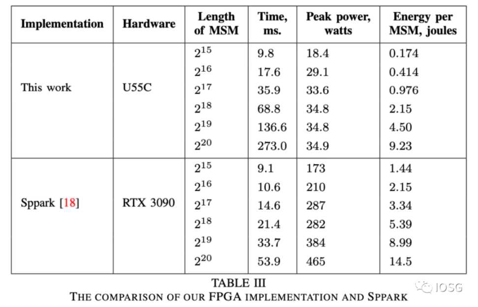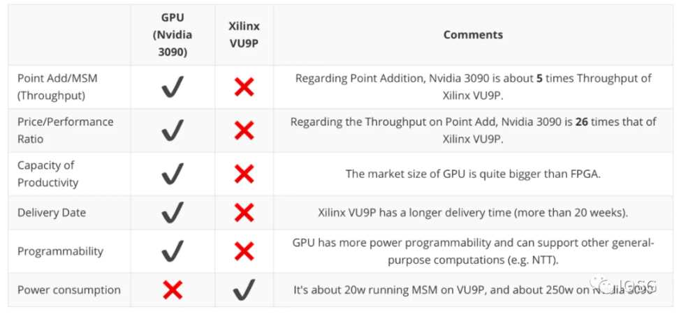 先看总结:以下是 trapdoor-tech 关于 GPU(以 Nvidia 3090 为例)以及 FPGA(Xilinx VU9P 为例)在几个维度的总结,非常重要的一点是:GPU 在性能(生成证明的速度)方面要高于 FPGA, 而 FPGA 在能源消耗则更具有优势。