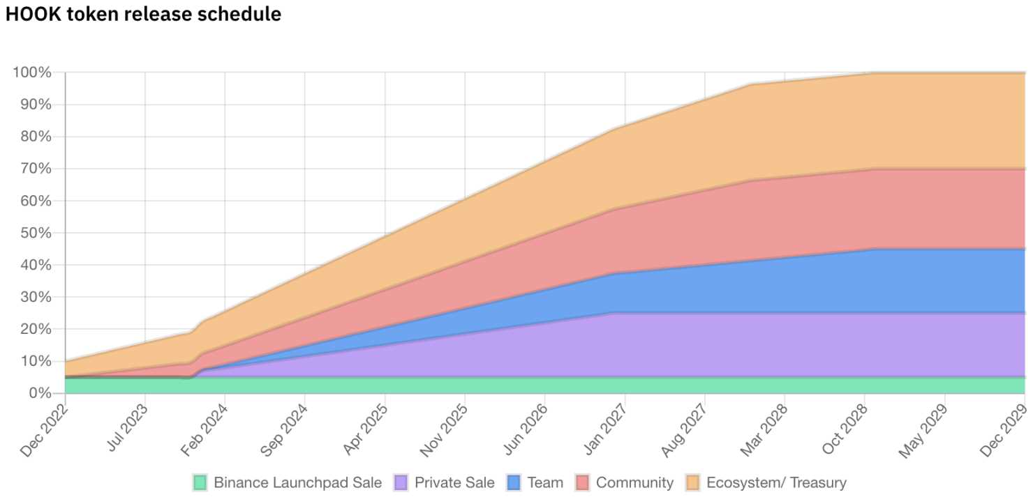 HOOK 货币根据 BNB 链,总产量 5 亿枚。在其中 20% 用以私募基金,20% 归入精英团队,30% 归入生态体系和财政,25% 归入小区,5% 用以币安网 Launchpad。私募基金价格是 0.06-0.12 美元,币安网 Launchpad 价格是 0.1 美元,其实就是 5000 万美元的公司估值。
