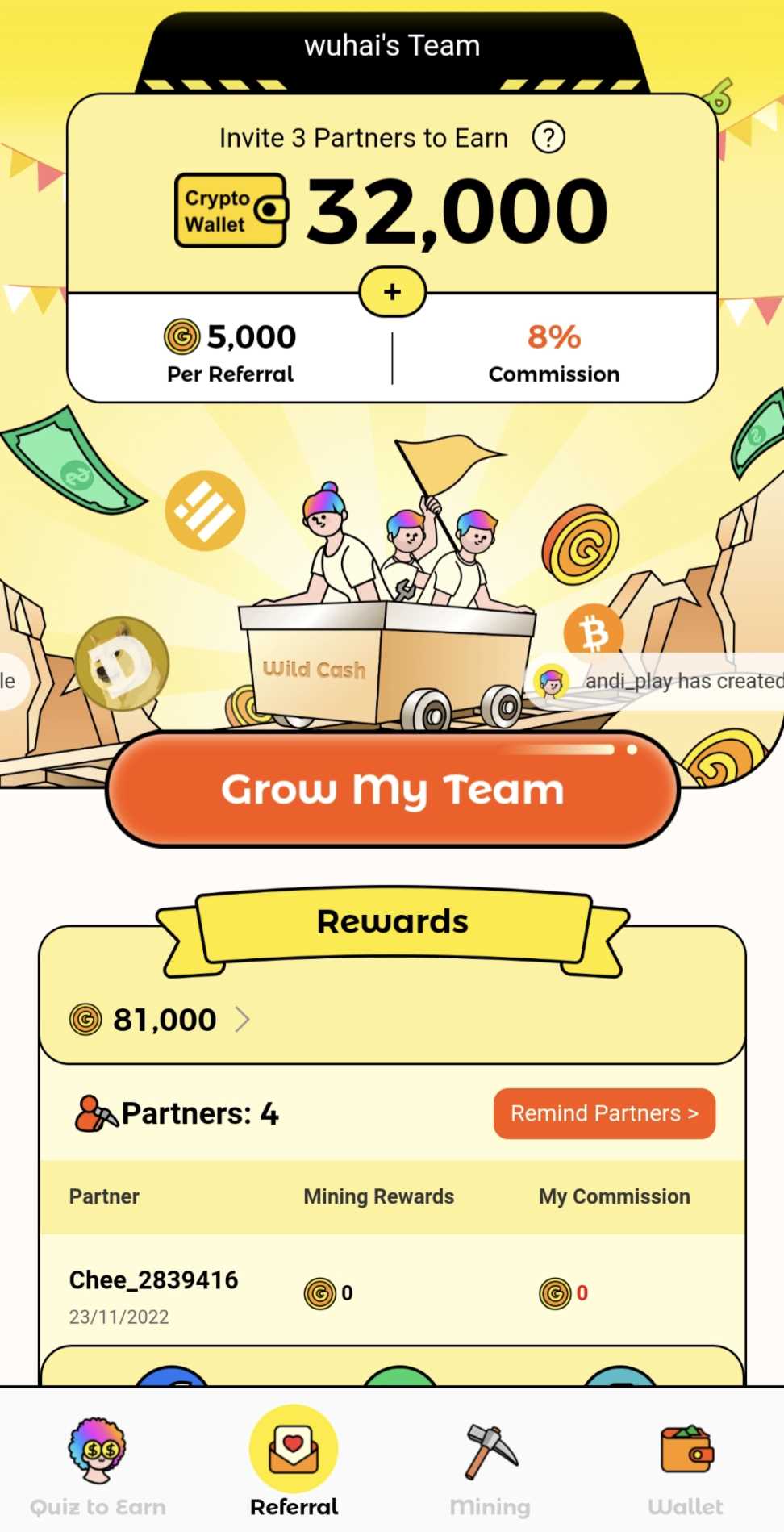 现阶段 Wild Cash 里的赚币方法分别为解题赚币、邀约赚币、POWT 挖矿、质押贷款赚币。客户所赚到的货币为 Gold,只能在运用内应用,可用于升级游戏下载内游戏道具(更更高效的挖矿铁锹、矿用车等)。