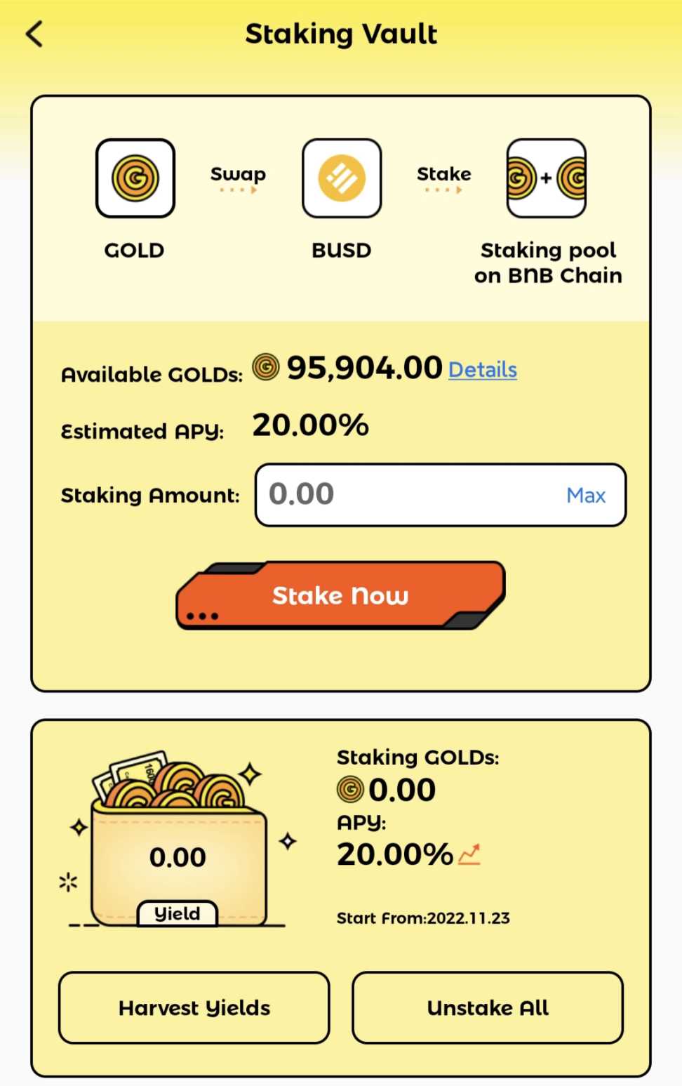 通过上述方法赚到的 HGT 能通过质押贷款获得大量货币,年收益率为 20%,质押贷款的货币可随存随用。当赚到的 Gold 做到 80 万枚后,用户可在运用内换取为 uHGT,再换取为 BUSD。依据 Wild Cash 运用内表明,Gold 和 uHGT 的兑换率为 1:1。依据 uHGT 现阶段二级市场价钱,80 万 Gold 货币使用价值 0.5 美元。