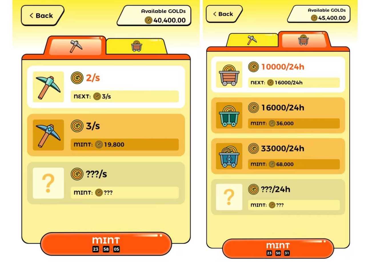 运用默认挖矿高效率为每秒钟挖出来 1 枚 Gold,挖矿期为 1h,单账户限制为每 24h 产出率 10000 枚 Gold。用户可以根据点一下 Tap 按键来提高挖矿高效率,还可以锻造挖矿更有效率的铁锹。2HGT/s 质量的铁锹锻造价格是 9600 枚 Gold,3/s 质量的铁锹锻造价格是 19800 枚 Gold。与此同时能够提升矿用车容积来提高每日可挖矿总数,16000/24h 矿用车锻造价格是 36000 枚 Gold,33000/24h 矿用车锻造价格是 68000 枚 Gold。