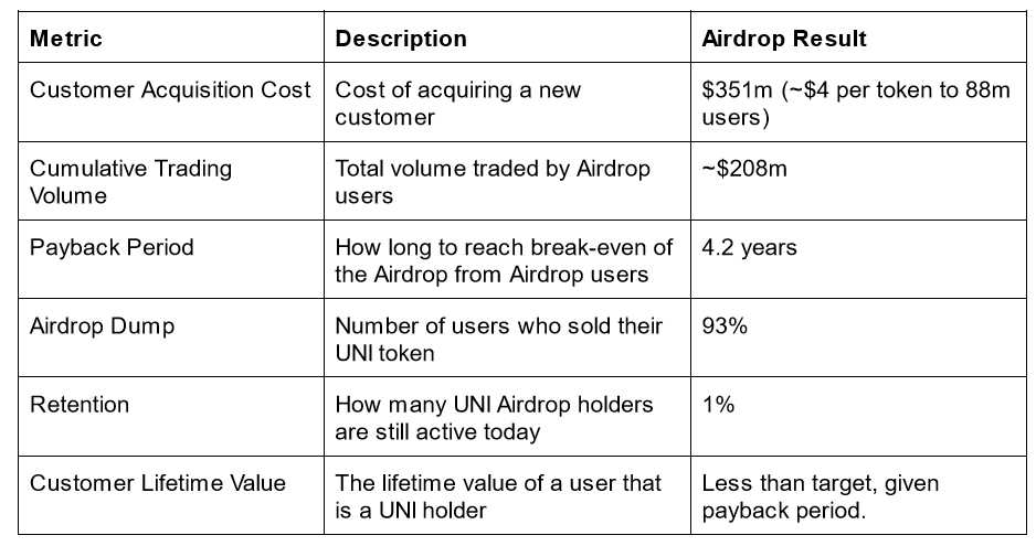 The wizards at Dune analytics did a wonderful deep dive on the UNI airdrop, along with a quick look at a few other airdrops. Given we recently wrote about the tracking of other important web3 project health metrics to monitor, we wanted to correlate Dune’s analysis to some of those metrics like Customer Acquisition Cost, Payback Period, Retention, and Customer Lifetime Value.