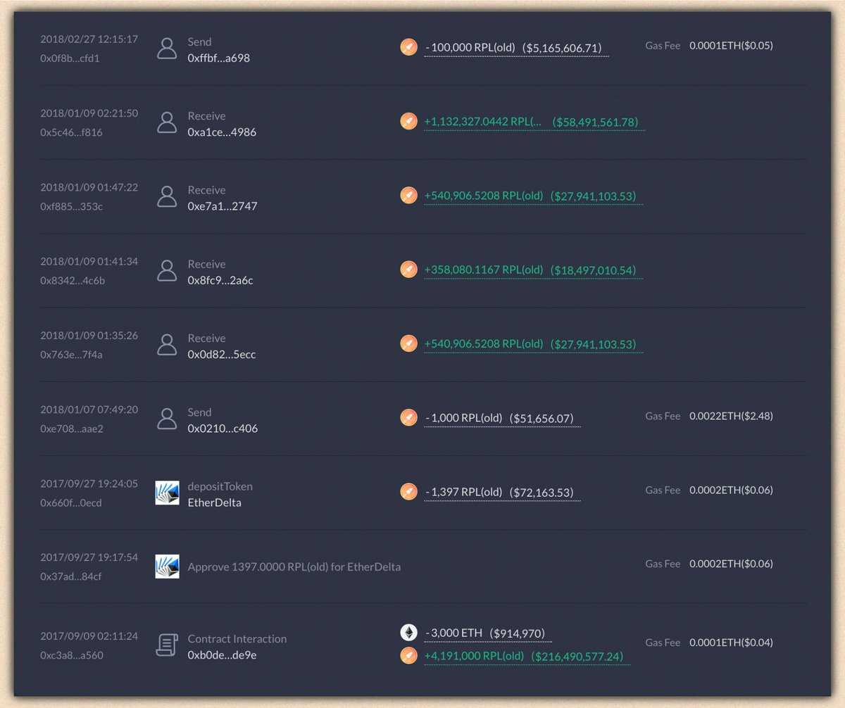 Patricio 钱包现阶段持有使用价值 1 亿美金以上代币,绝大多数 RPL 在 2018 年已经投资了,自此一直在盈利撤出(如图所示)。