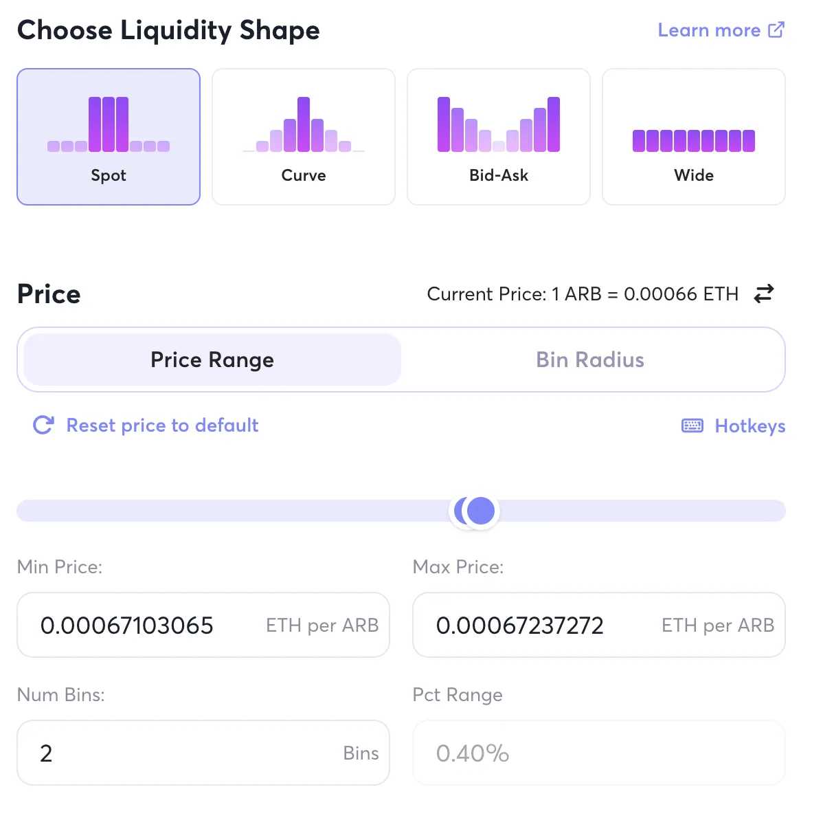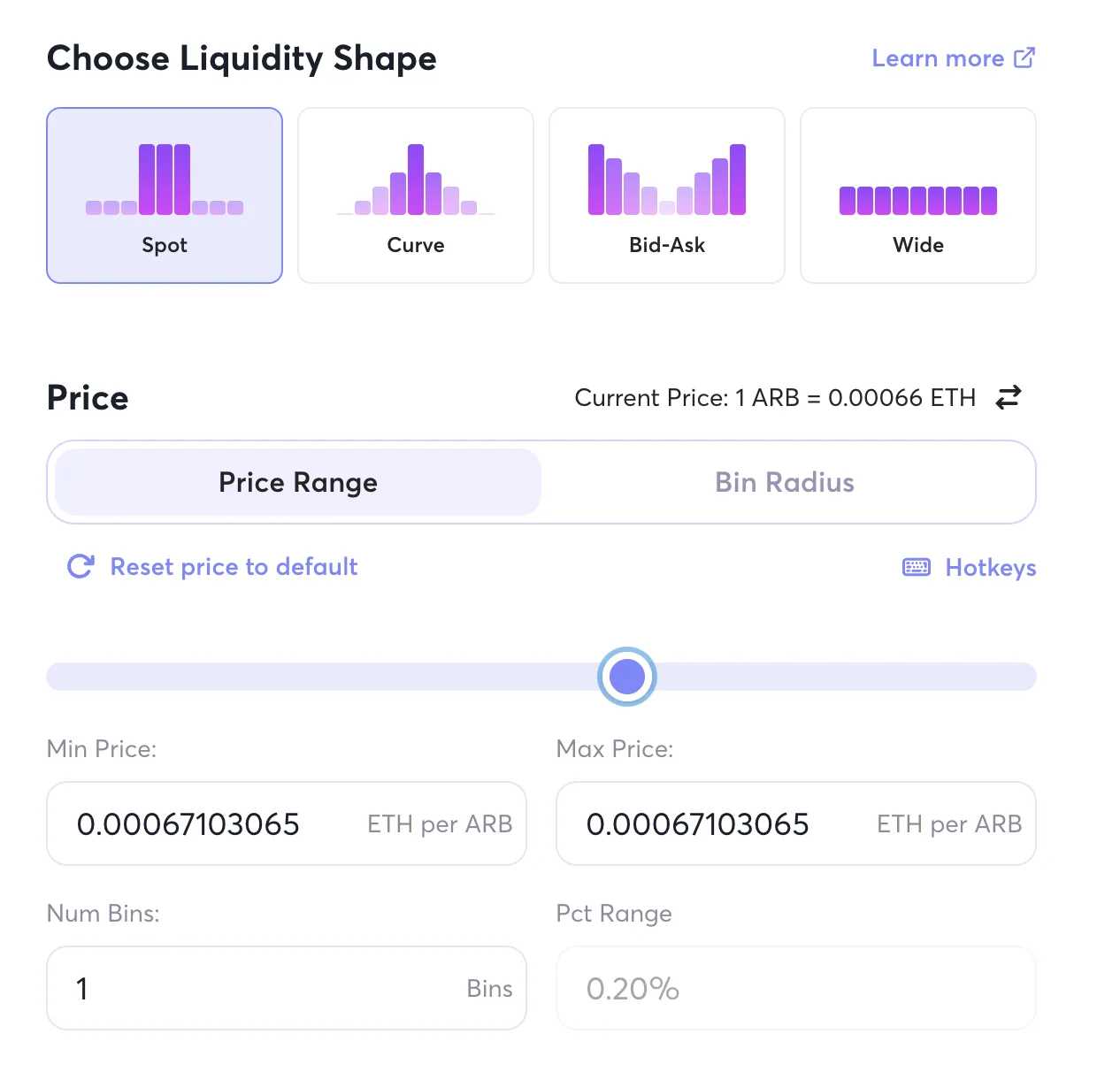 我们再对该池尝试添加流动性,发现是可以添加单点流动性,就是说添加的流动性就在一个价格上,这其实就相当于在订单簿中放一个 Maker 单。那旁边的 Pct Rage = 0.20% 是怎么回事?