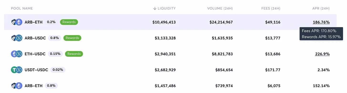 加上 Joe 针对 ARB/ETH 的交易对设置了 0.2% 的费用,而在当时由于波动预期较高,UNI 又只能设置 0.01%/0.05% / 0.3%/1% 这四档,大部分LP 位于 0.3% 以上档位,相比 Joe 的 0.2% 又有劣势。