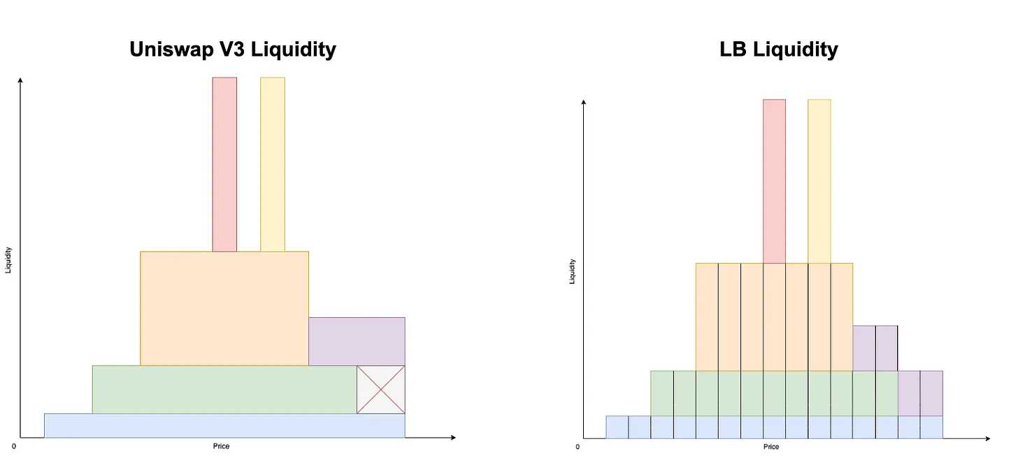 由于在 Joe V2 中,流动性是通过每个 bin 垂直聚合的,而在 Uniswap V3 中,流动性是横向聚合的。垂直聚合的主要好处是它允许流动性可替代。