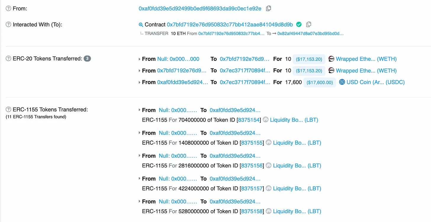 我们看一笔具体添加流动性的交易,会发现在用户添加 ETH/USDC 后,Joe 给用户返回了大量不同Token ID 的 ERC-1155 LBT,反应了用户在不同价格水平上的流动性分布。