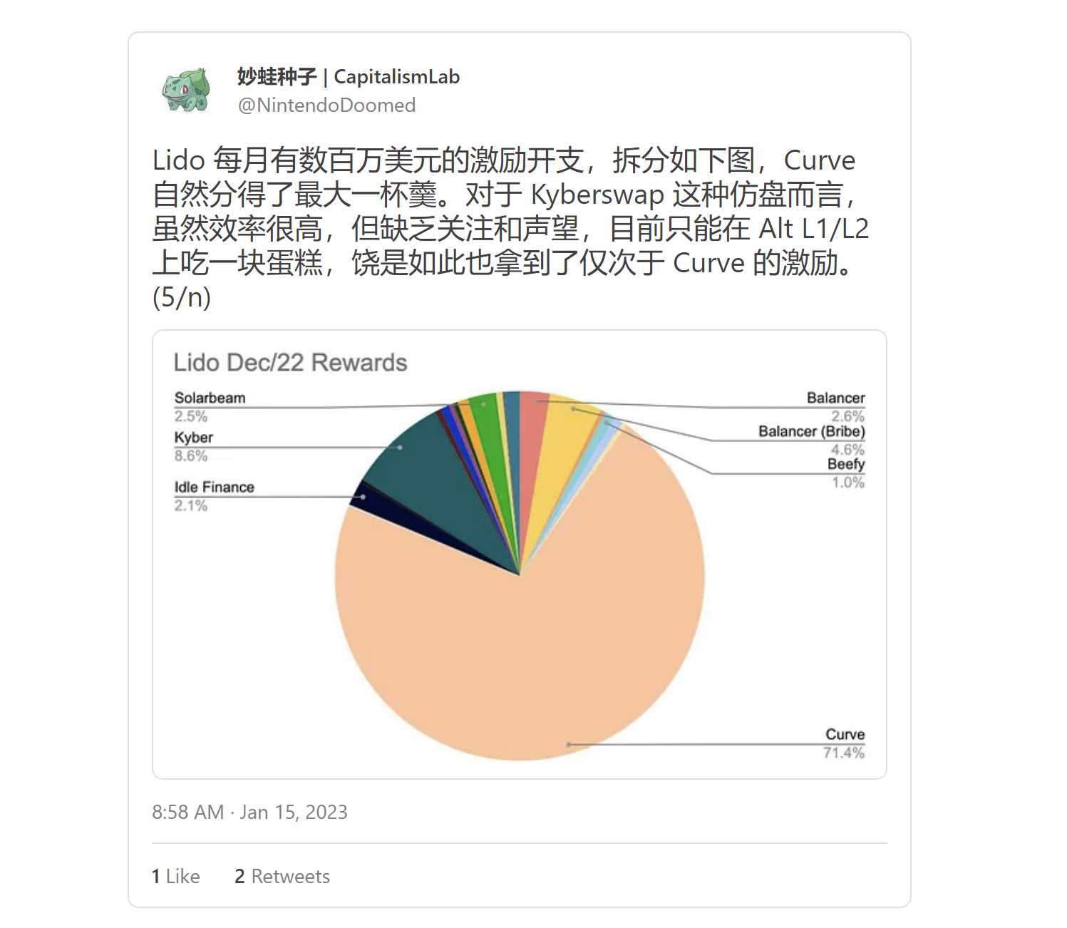 集中流动性高效率+支持激励,有望吸引到 LSD 等有流动性需求的合作方来提供激励,比如此前 UNI V3+ 激励 模式 Kyberswap, 就从 Lido 拿到了仅次于 Curve 的激励分配(参见下方推文) ,并且占据了极大的 Alt-l1/L2 的 LSD 交易量份额。