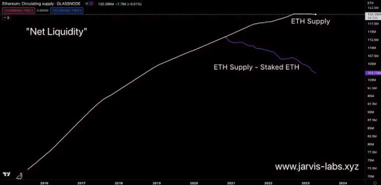 在下文的第一个数据图表中,一条线表明 ETH 的供应量。供应线下边的紫线表明减掉质押的 ETH 后 ETH 供应量。这是一种查询 ETH“净流动性”的形式。