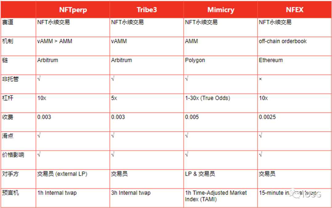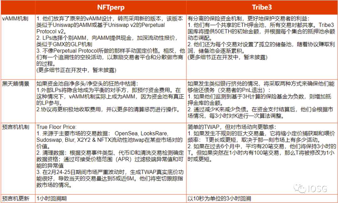 NFTperp和Tribe3二者的关键差别表现在vAMM体制经典设计、灰天鹅场景解决、预言机喂价和升级这几方面(见下图)。但是目前仍然无法判断哪一种体制能够首先寻找PMF,由于取得成功很有可能极度依赖于海豚的获得能力及生态系统中的发展趋势。