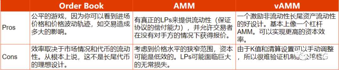 针对Orderbook、AMM、vAMM这三种体制的简易优劣分析由此可见下面的图: