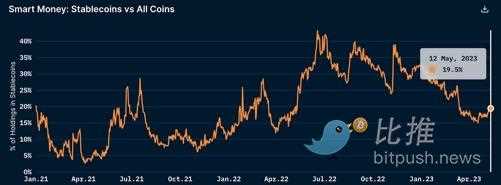聪明钱Smart money详细地址继续增加他的净稳定币开放式,从 4 月 17 日的底点升高 1000 个百分点至 19.5%,这一日期是meme币价钱短暂性冲强的后一天,这不是偶然。