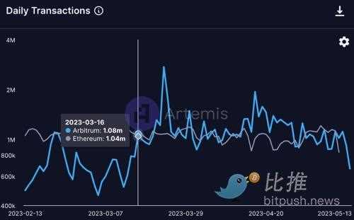 以 DeFi 为核心的 Arbitrum 一直就是这一改变的关键获益者,自 3 月中下旬公布 ARB 货币至今,每日成交量与以太坊自身的成交量维持同歩。