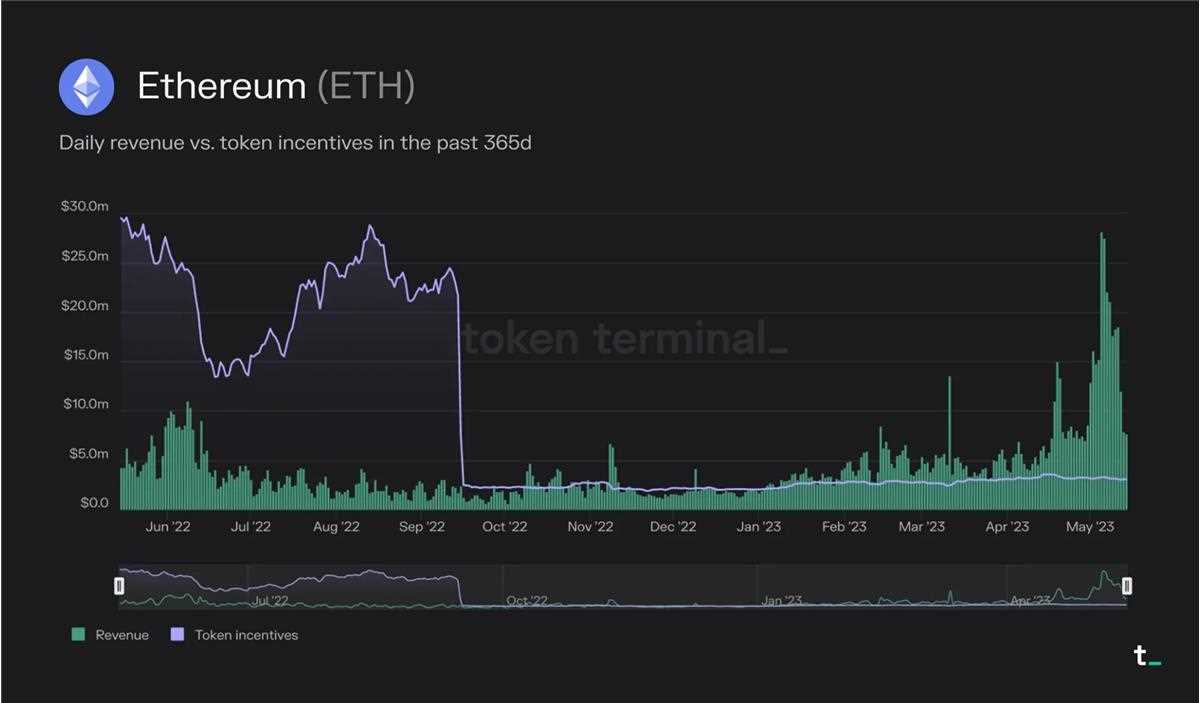 业务合并,ETH 供货在大利用率期内一直处于通货紧缩情况。比如,在今年的 5 月,消毁的 ETH 总数(收益)一直超过做为质押贷款奖赏(货币鼓励)锻造的 ETH 总数。