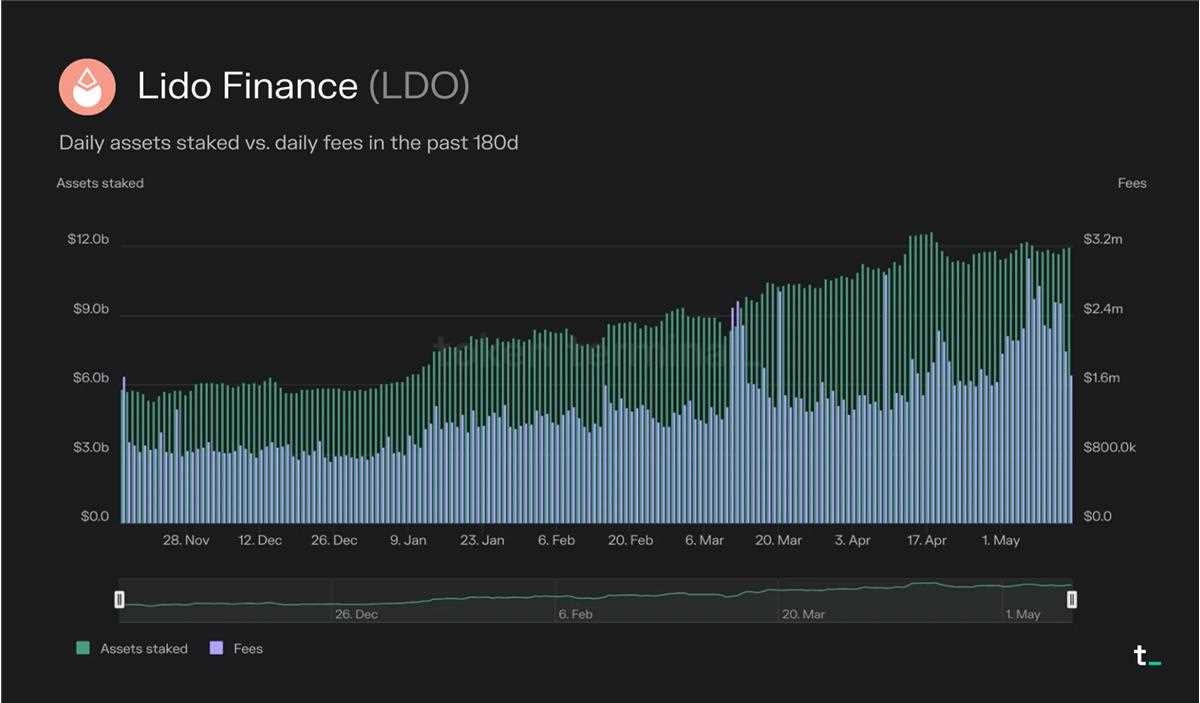 Lido 已经成为流通性质押贷款销售市场领域内的现阶段市场领导者,质押贷款总资产达 120 亿美金。这个数同比增长 38%,以往 180 天增加了 105%。