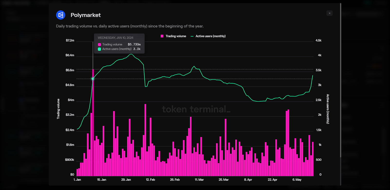 根据 Token Terminal 的数据,Polymarket 今年以来的最高交易量出现在 1 月 10 日,为 573 万美元。这个平台在 1 月经历了月活人数的显著增长,从 1 月 1 日的 1600 人上升到 2 月 1 日的 4100 人,4 月后的月活数有所放缓。截至 5 月 15 日,Polymarket 上的预测金额已达 2.027 亿美元。