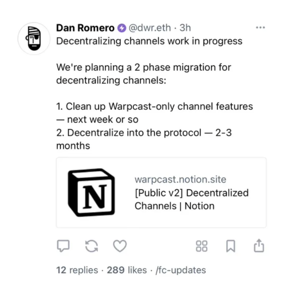 Channel 遵循 Farcaster 中 “Cozy Corner” 的理论,允许在更大的社交图谱中出现小社区。这是一个重要的差异化因素,Farcaster 的创始人意识到这一愿景可以使产品在构建更强大的社交图谱方面脱颖而出。这个概念虽然是 Warpcast 的一个功能,但计划完全去中心化,因为 Dan Romero 认识到其独特的价值主张。通过培养这些小型、集中的社区,频道可以增强用户参与度,创造更亲密的社交体验。
