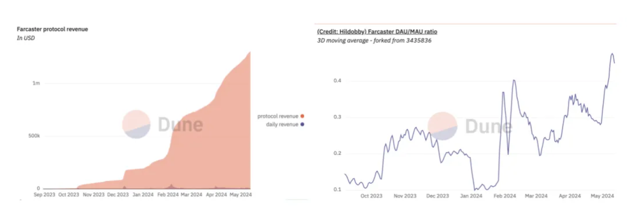 更高的 DAU/MAU 比率也表明 Farcaster 的保留率在增加,每日用户数量接近月度用户数量。这显著且几乎直接地促成了 Farcaster 团队的收入增长。