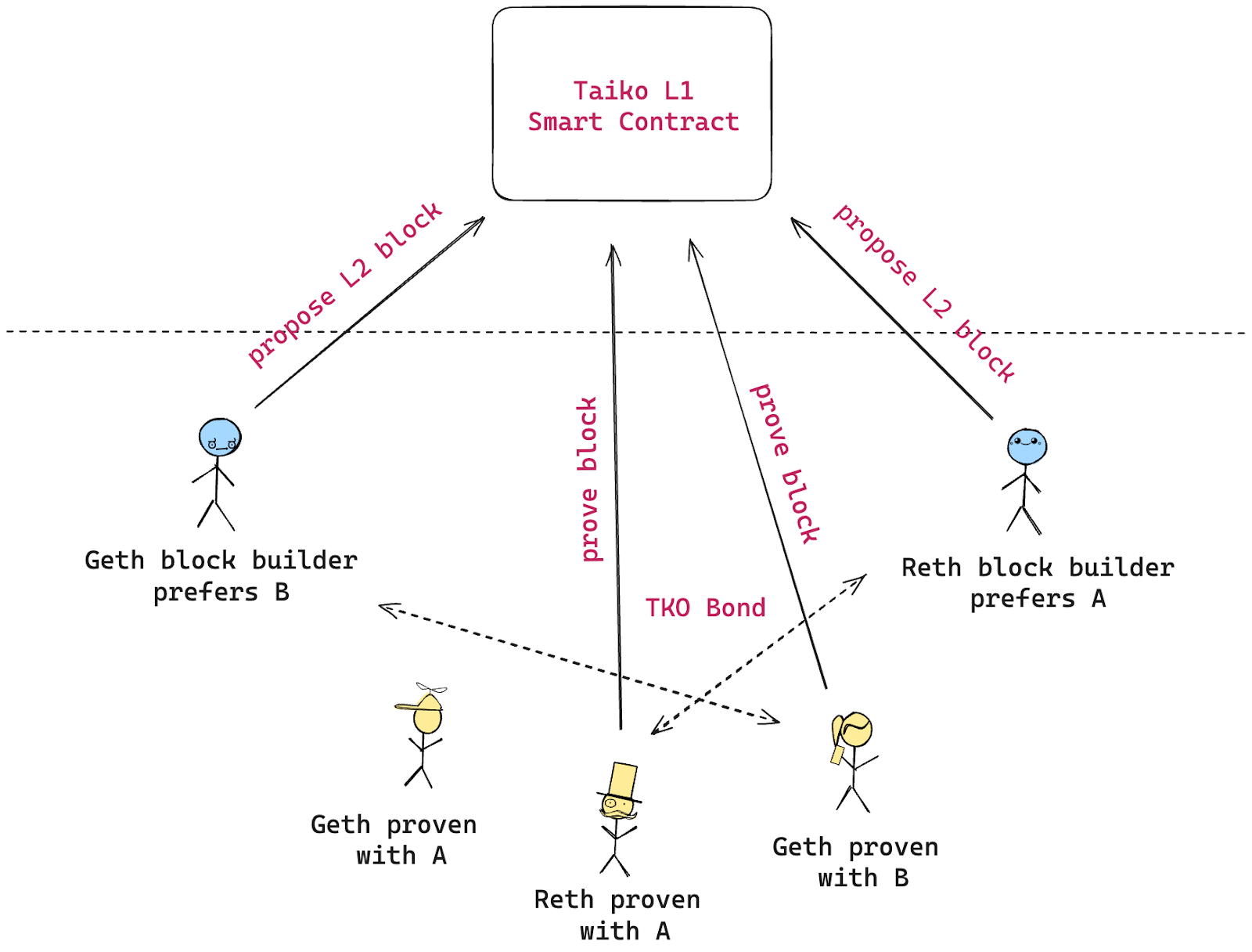 Multi-Prover: 利用多种zkVM和SGX等集成证明系统,直接编译及运行基于Rust的以太坊虚拟机,生成零知识或TEE证明以验证以太坊区块执行的准确性和完整性。通过 Multi-prover,Taiko 可以在不改变现有智能合约和 dApps 的情况下扩展以太坊,同时继承以太坊安全性、去中心化和兼容性。