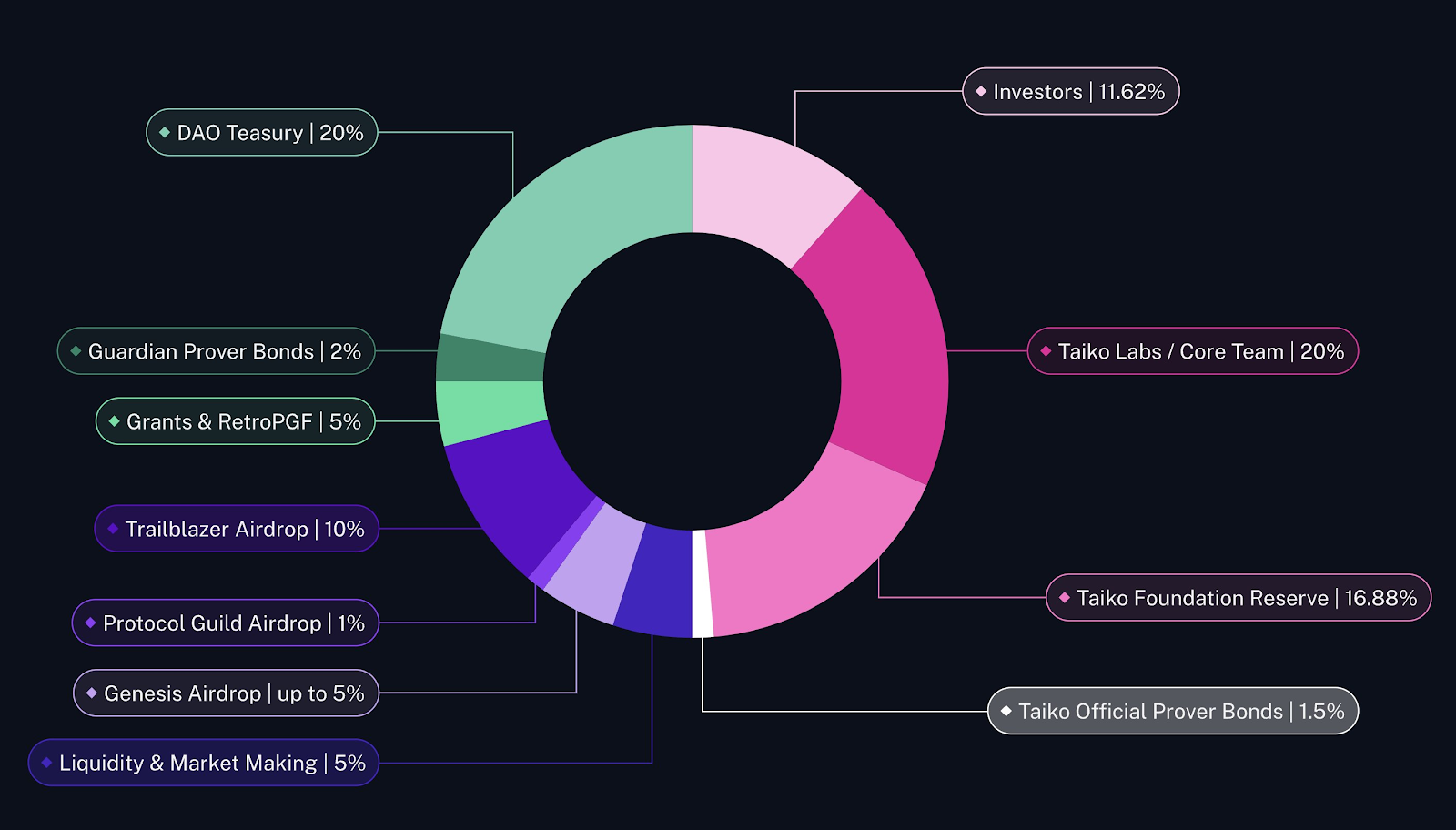 根据 Taiko 公布的代币经济学模型,TAIKO 代币总供应量为 10 亿枚,其中 5% 代币将分配给创世空投,空投对象包括区块提议者、区块证明者、与测试网交互的用户、参与 Galxe 活动的用户以及在符合条件的存储库上进行 Github 贡献的用户等。此外,TAIKO 空投申领将在 Taiko 主网 L2 上进行,空投代币不锁定,也无归属期。