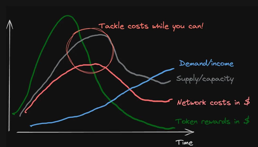 好消息是,有许多方法可以应对这种情况。一种方法是使代币发放更加灵活,使其更符合网络的货币化(见 KPI 基础的发放)。另一种方法是解决成本问题,使整体网络更高效,使其对代币价格下降的敏感度降低。我们的方法将如下所示: