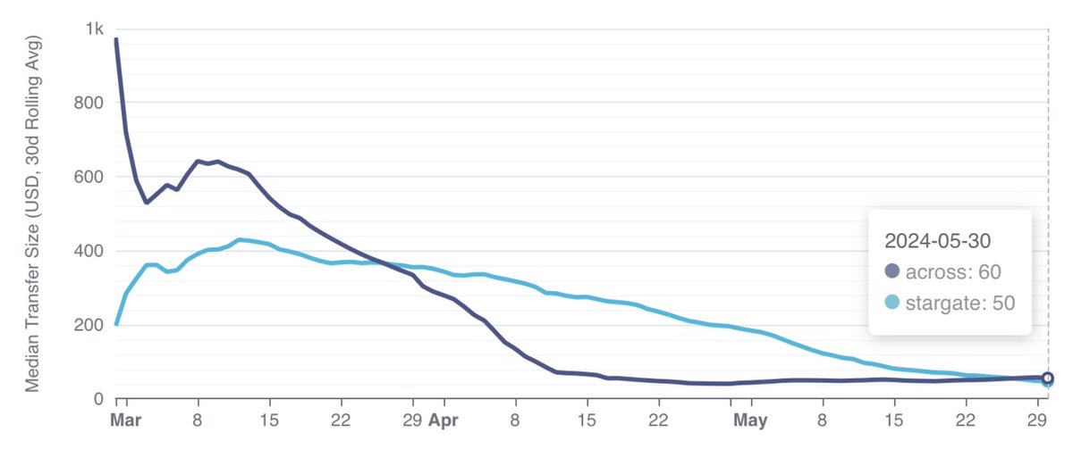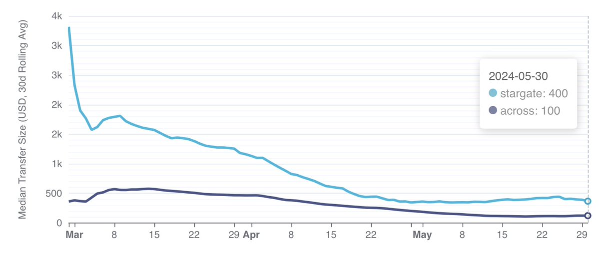 以下是三个最大的 L2 的 30 天滚动平均 L2 到 ETH 交易规模,使用 Across 和 Stargate 数据进行测量: