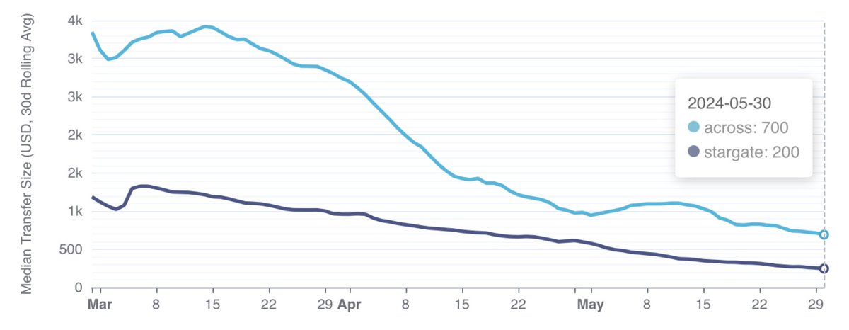 以下是过去30天滚动平均的L2到L2桥接交易规模,使用Across和Stargate数据进行测量: