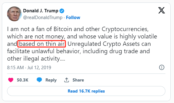 虽然特朗普在之前的任职总统期间(2017 年 1 月—2021 年 1 月),一直公开表达对加密的否定态度,认为加密资产是「稀薄的空气」,不过近两年来他在行动上却很「诚实」,成为了目前最会玩加密货币的总统候选人之一。
