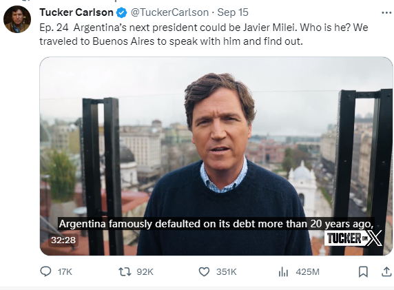 美国著名记者塔克·卡尔森(Tucker Carlson)对曾对米莱进行采访,该采访在推特上浏览量超过 4.21 亿次。这份采访的的关键内容之一是阿根廷经济的美元化。在该该提案中,米莱一直强调取消阿根廷中央银行的重要性,并谈到比特币可以为这一过程提供机会。