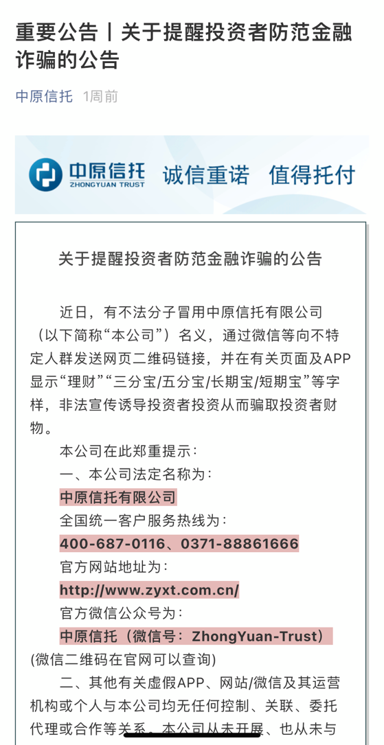 10月底,中原信托官方微信公众号发布声明称,近日,有不法分子冒用中原信托名义,通过微信等向不特定人群发送网页二维码链接,并在有关页面及APP显示“理财”“三分宝/五分宝/长期宝/短期宝”等字样,非法宣传诱导投资者投资从而骗取投资者财物。