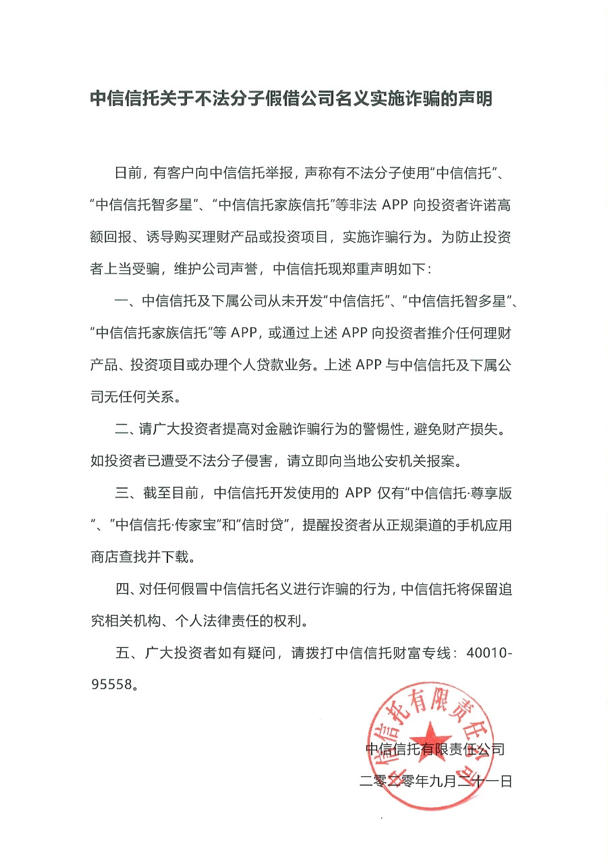 今年9月,中信信托声明称,日前,有客户向中信信托举报,声称有不法分子使用“中信信托”、“中信信托智多星”、“中信信托家族信托”等非法APP实施诈骗行为。(本文转自防骗大数据:FPData)