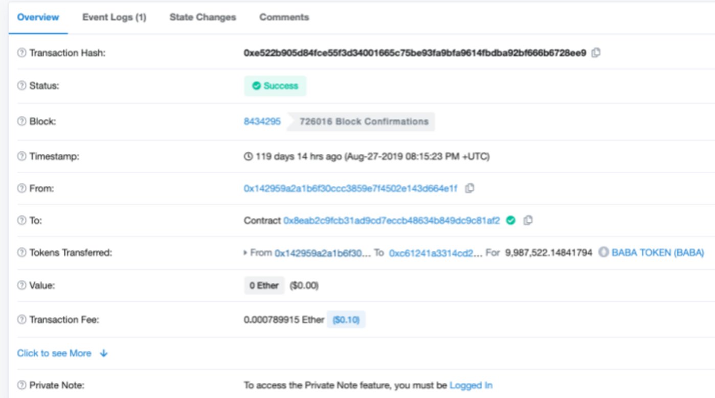 区块链信息显示,BABA发行后,有1000万枚Token被转移至一个后缀为“4e1f”的地址。