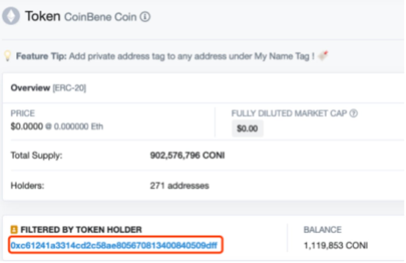 而这个9dff的地址,属于满币网平台币CONI的创建者——这是满币网的官方地址。