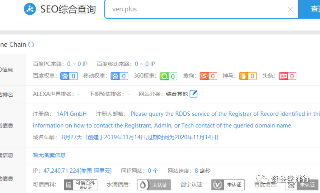 可能这个代币想做的逼真点,在上线前还搞了个官网,不过这网址注册的挺早,看其域名应该是之前想搞其他项目留下的ven.plus。不想扔掉用在了AL代币上。看得出来,AL项目方挺勤俭节约的?