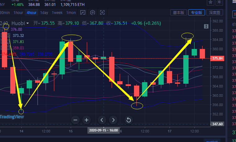 以太坊行情如期迎来一波下跌,从昨日凌晨高点384一路震荡下行,直到今日早间最低点也是触及355一线位置,下跌近30点。行情已经走出背离,这波下跌只是时间早晚的问题。上方顶部就在400附近,作为前期的承压阻力点。迟迟不破,势必要跌。四小时图看,布林带呈缩口状态,币价在中轨上方运行,价格跌回MA10日均线之下,附图指标上看,MACD快慢线在0轴上方粘合死叉朝下,量能柱在0轴下方缩量运行,KDJ三线呈向下的发散趋势,DIF和DEA呈粘合趋势,目前价格运行在378附近震荡趋势,小时级别和日图都呈现上行动能不足,回调蓄力盘整阶段