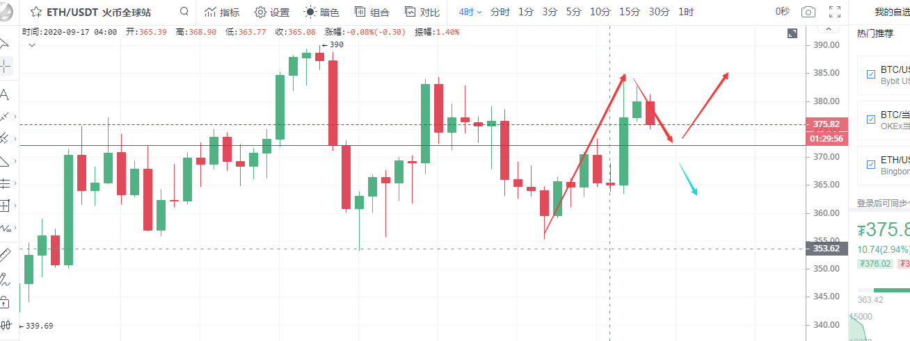 ETH行情分析:4小时图来看,布林带微微张口,5日均线上穿10日均线交金叉运行,MACD交金叉探头向上运行,KDJ三线向上发散,RSI指标金叉向上延伸,目前接近超买区域运行,以太坊目前整体还是在一个箱体区间震荡运行,短期上方关注385一线压制位,下方关注布林带中轨支撑371附近。从小时图看,币价上午暴力拉升至384.88一线受阻回落后进入了375-385的窄幅震荡区间,从小时图看,5日均线下穿10日均线向下运行,附图MACD即将形成死叉,绿色动能量,弱势减弱,空单的话下破370一线在考虑买入。综合来看还是多头占优。晚间彤欣建议操作上回踩做多。